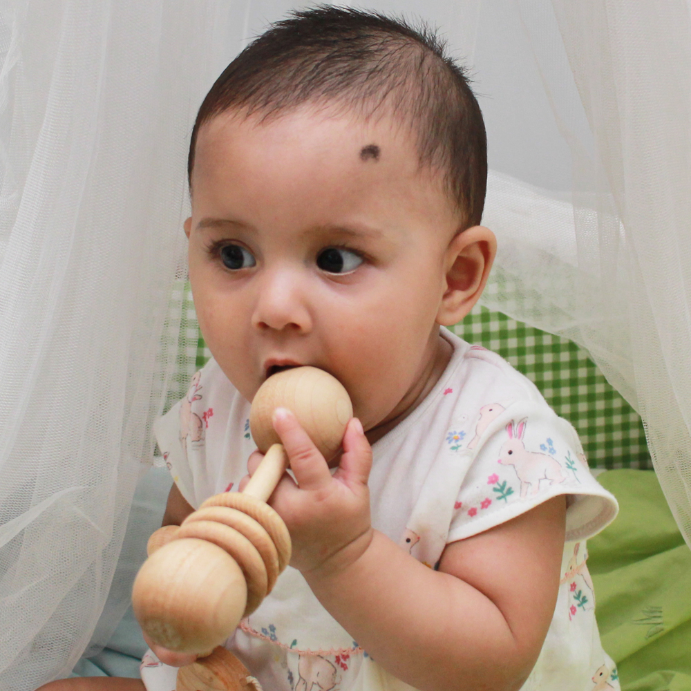 This Montessori-inspired dumbbell rattle is a favorite among teething babies. Its rhythmic beads and natural wood texture provide soothing relief for sore gums while offering rich sensory stimulation. Dentist-designed to support oral-motor development and certified to international standards, it’s the perfect mix of play, comfort, and safe teething support.